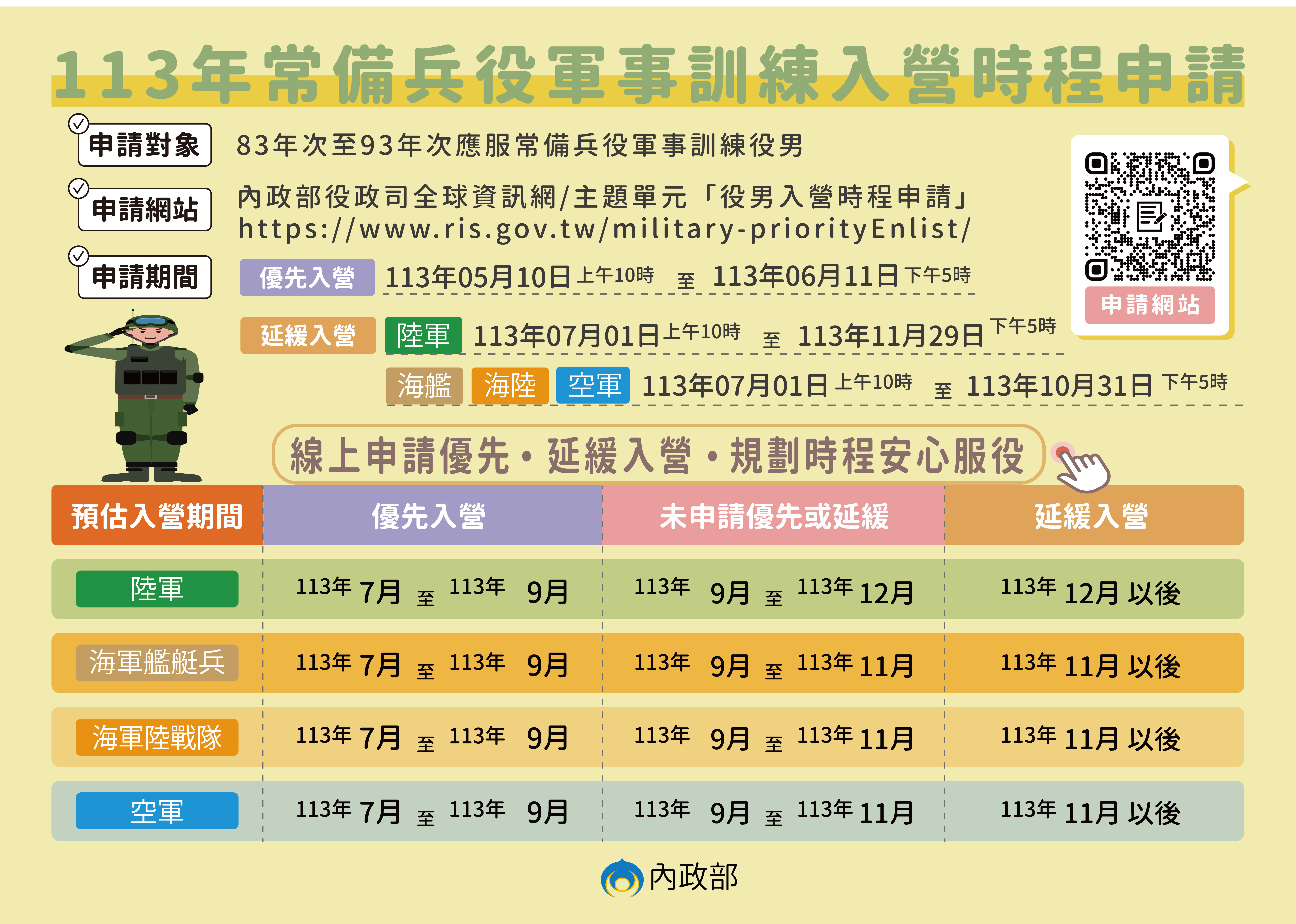 檢附「113年應接受常備兵役軍事訓練役男(83年次至93年次),申請優先入營、延緩入營之對象條件及相關作業規定」公告及「113年常備兵役軍事訓練入營時程申請」懶人包。