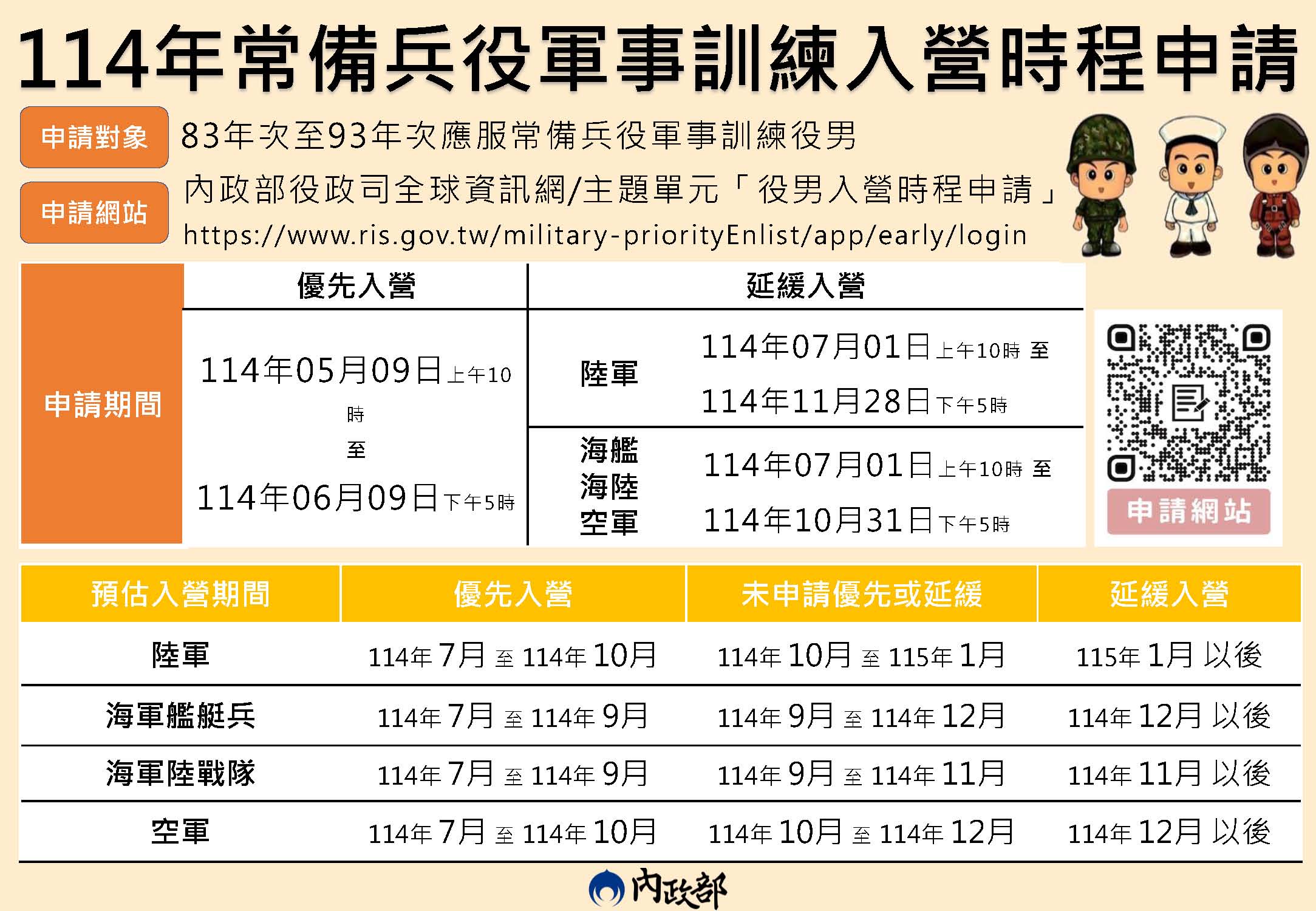 【兵役資訊】114年應接受常備兵役軍事訓練役男(83年次至93年次)申請優先入營或延緩入營案